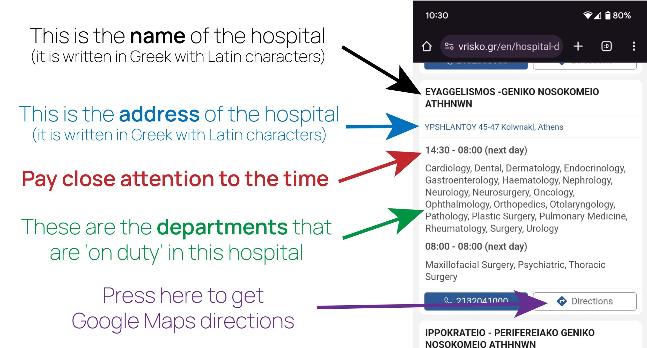 4) Choose the hospital, and make your way there (using the Google Maps directions)